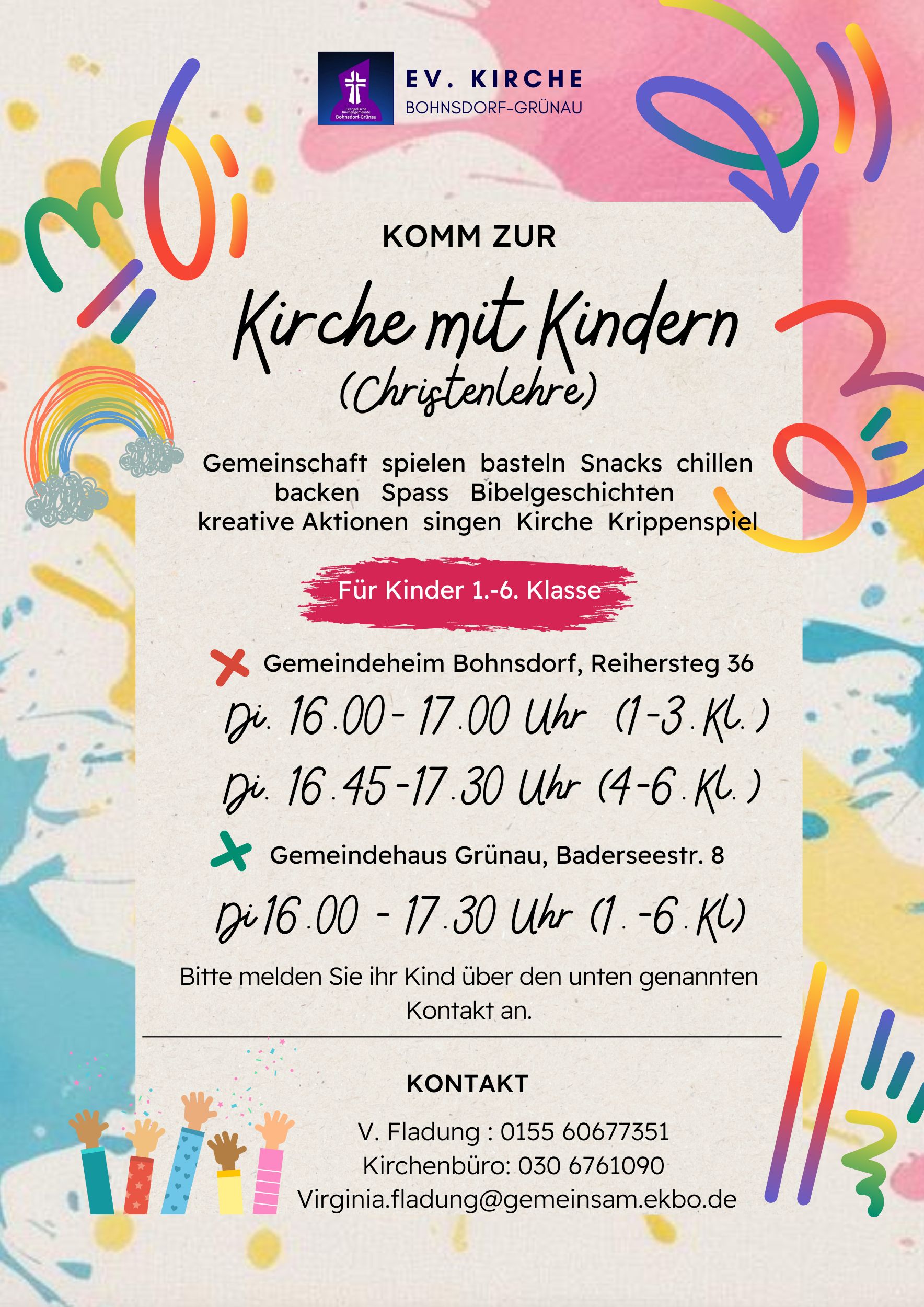 1. bis 6. Klasse | Virginia Fladung virginia.fladung@gemeinsam.ekbo.de | Tel.: 0155 606 77 351 |