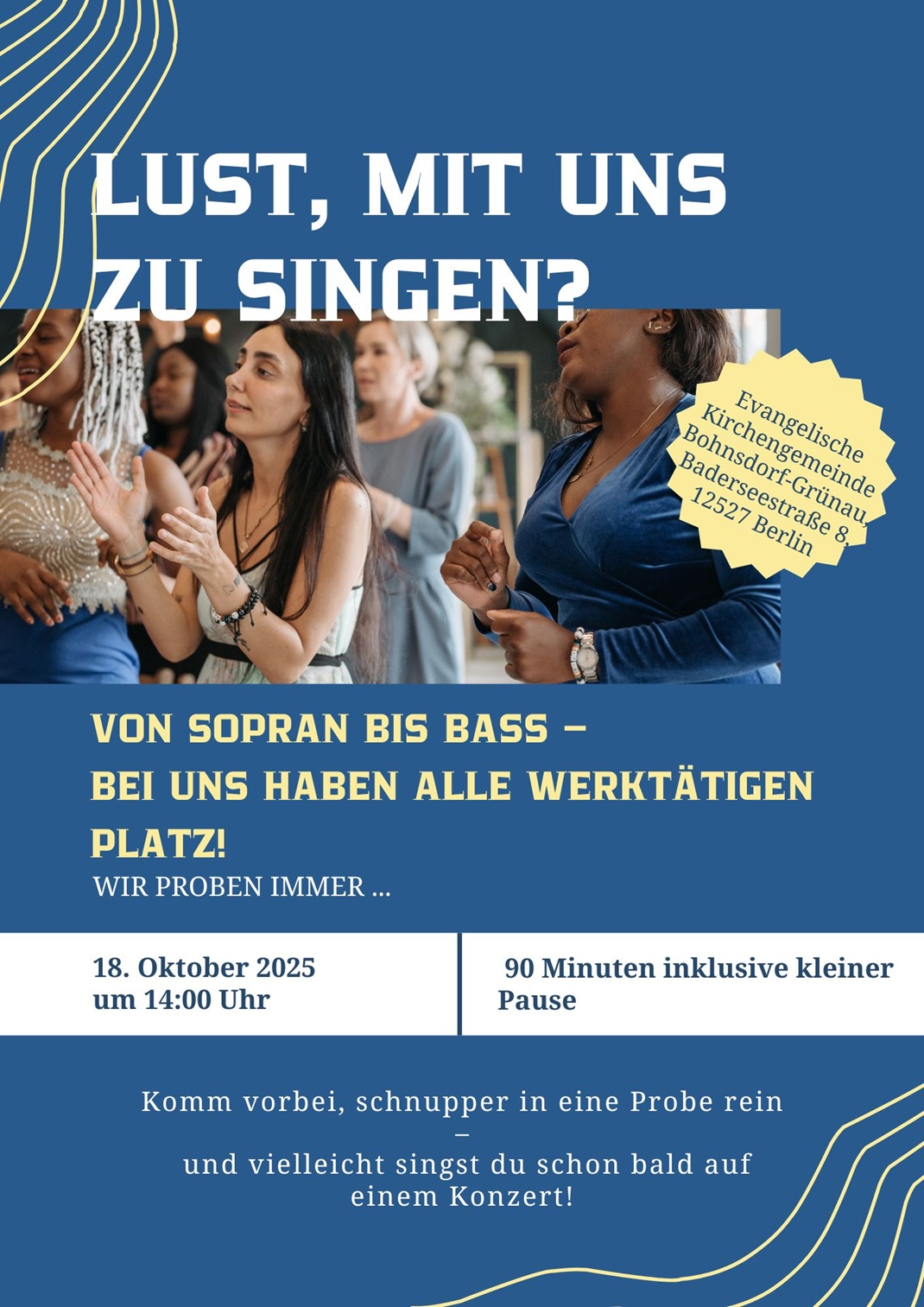 Treffen vom Kirchenchor Bohnsdorf-Grünau um 14 Uhr, Baderseestraße 8