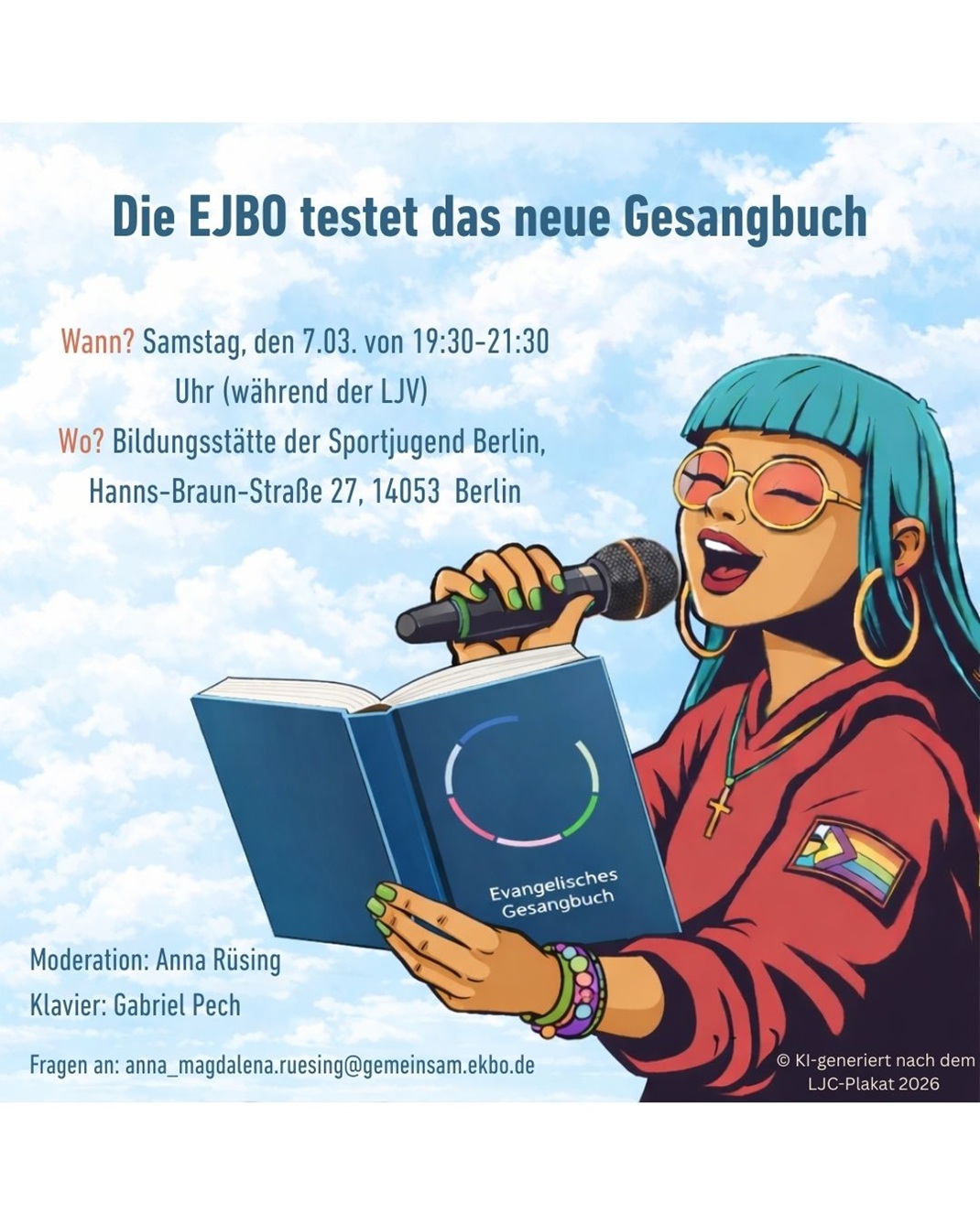 Falls ihr Interesse habt, am 7.03. aber nicht könnt: es gibt es am 9.05. noch einen Workshoptag von der EKBO zum neuen Gesangbuch, wo es auch total schön wäre, wenn ein paar jüngere Menschen kommen würden. Eine detaliertere Beschreibung und die Anmeldung sind unter diesem Link zu finden: https://www.ekbo.de/feiern/gottesdienst/evangelisches-gesangbuch