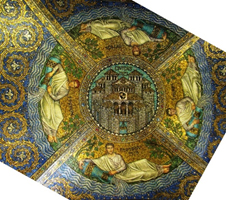 Die vier Paradiesbäume weisen mit ihrer Spitze auf eine Taube in der Kuppel. Diese Taube fliegt in die Sonne, d. h. sie fliegt in den Himmel. Der Himmel ist in der Friedenskirche in die Kuppel der Apsis gelegt. Da thront Christus der Weltenherrscher oder auch der Friedensfürst. Dorthin fliegt die Taube vom Paradies Abb. 15, Abb. 16.