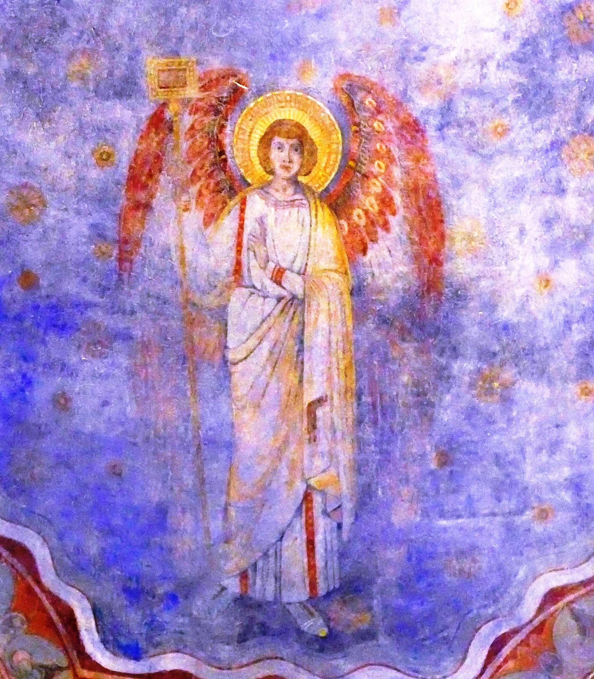 Der Bogen trennt das Kirchenschiff von der Apsis ab. Im Scheitel des Bogens ist das Lamm Gottes mit 12 singenden und jubilierenden Engeln zu sehen. Das Lamm Gottes steht im engen Zusammenhang mit der Gottesstadt. „Im Lebensbuch des Lammes sind alle aufgeschrieben“, die in die Gottesstadt hineinkommen Off. 21, 27. Abb. 23